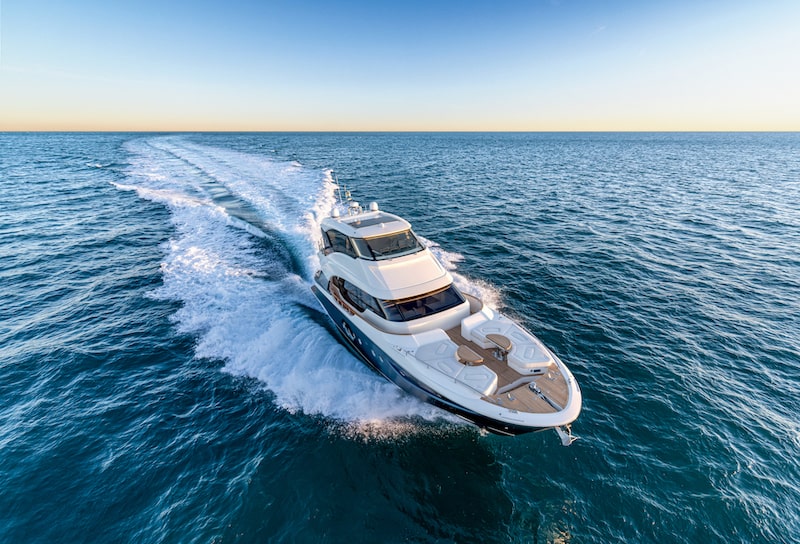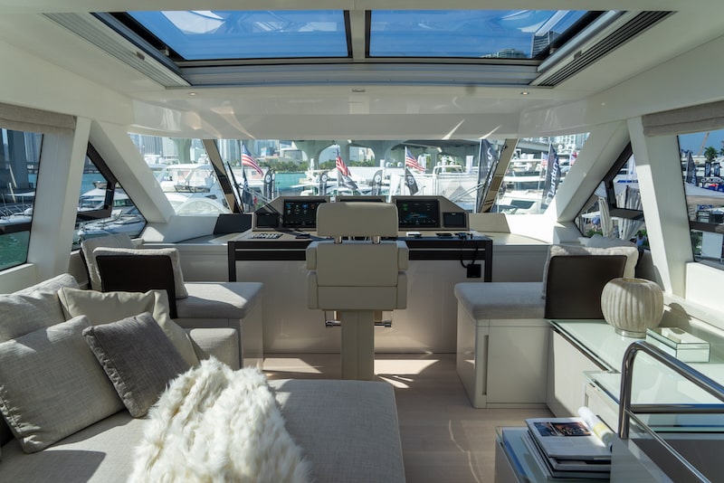 Monte Carlo Yachts offers a wide range of options, including the possibility to totally customize the main deck, where the absence of a console obviously increases the possibilities to create a custom, elegant and multi-function living room with a 360-degree sea view.