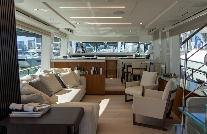 The main deck of the MCY 70 Slylounge is a very bright space, not only thanks to the elegant light-coloured furnishings that enhance the sense of well-being, but also thanks to the wide and spectacular windows that give the feeling of being in a painting.
