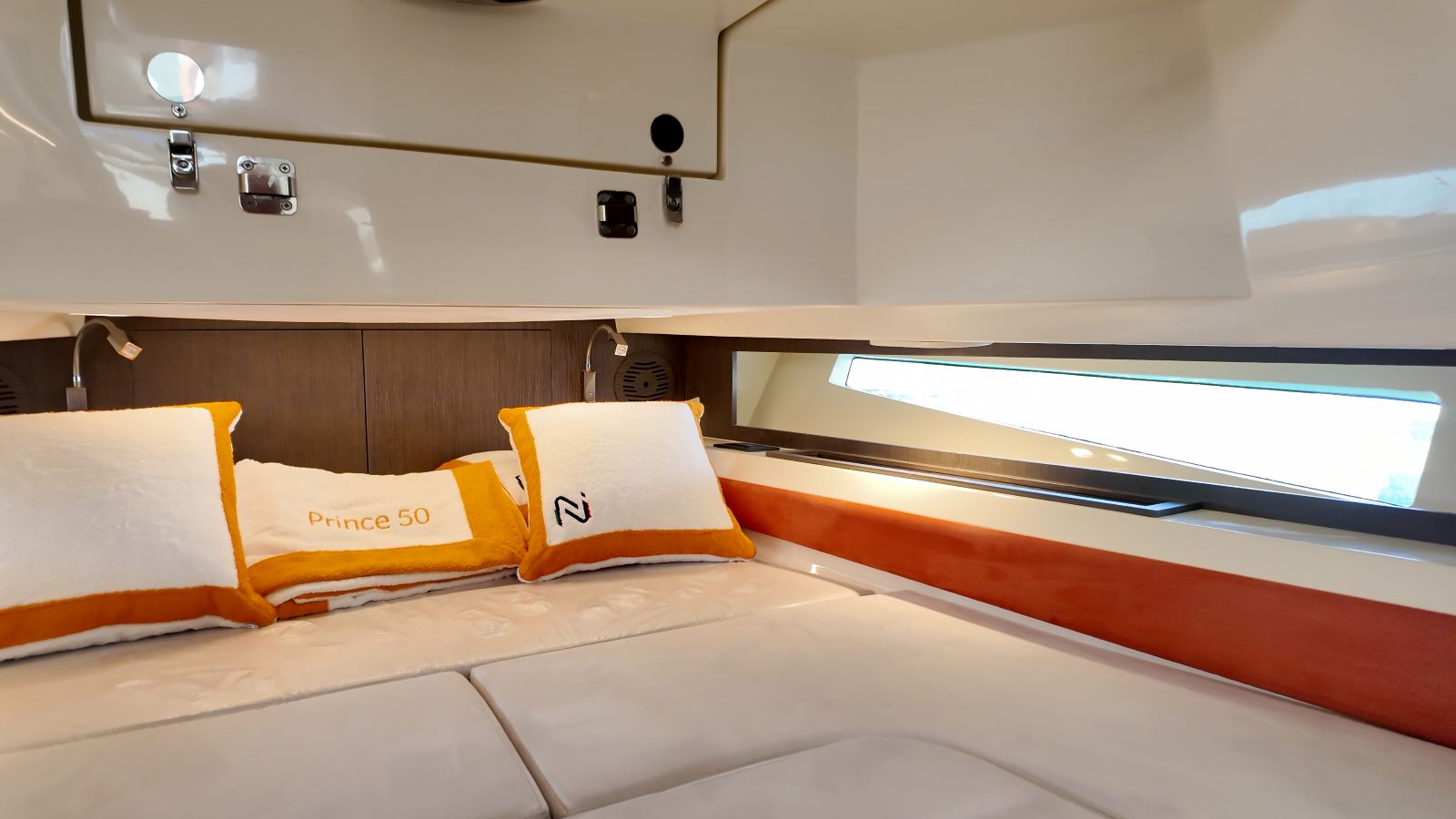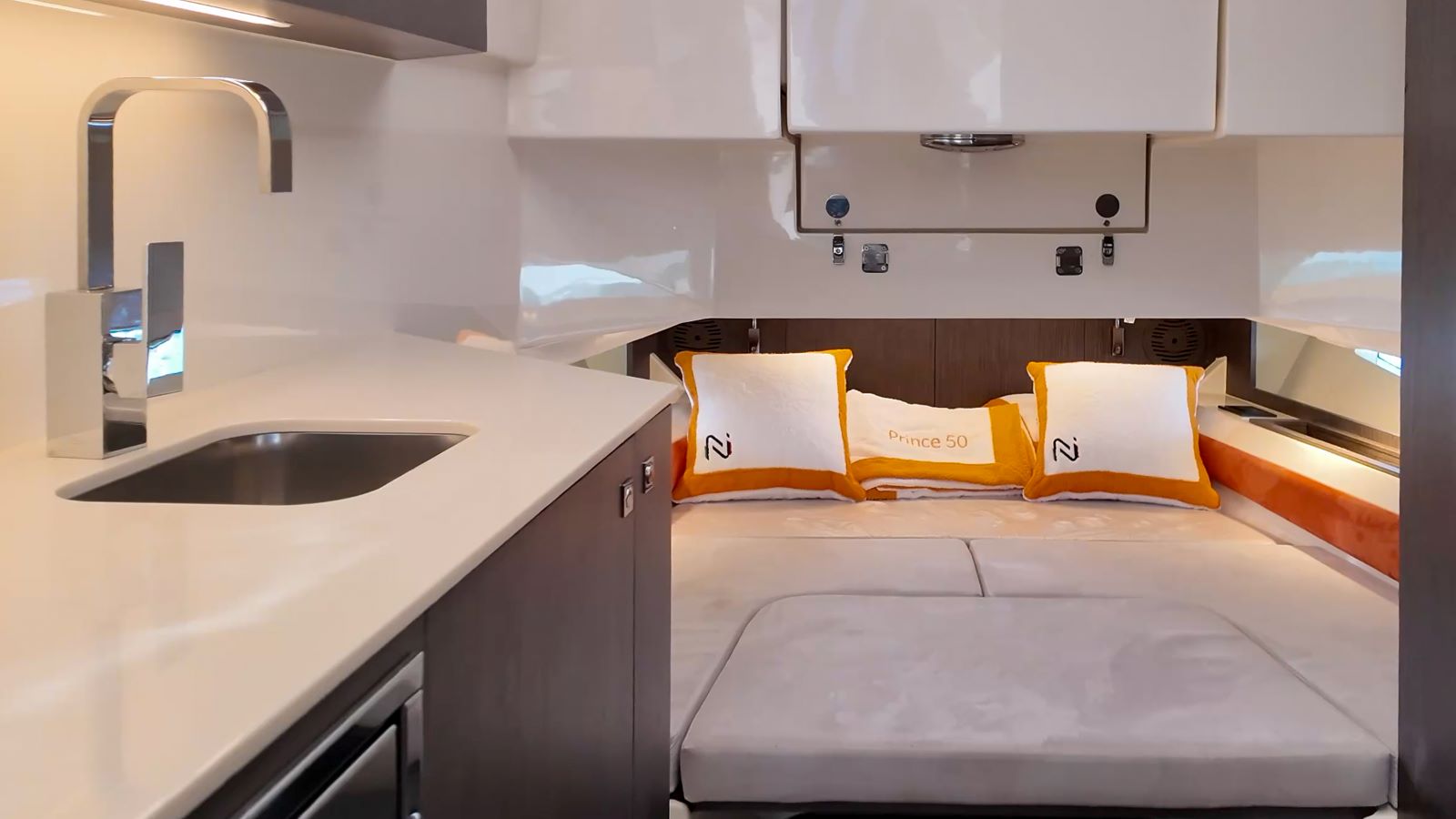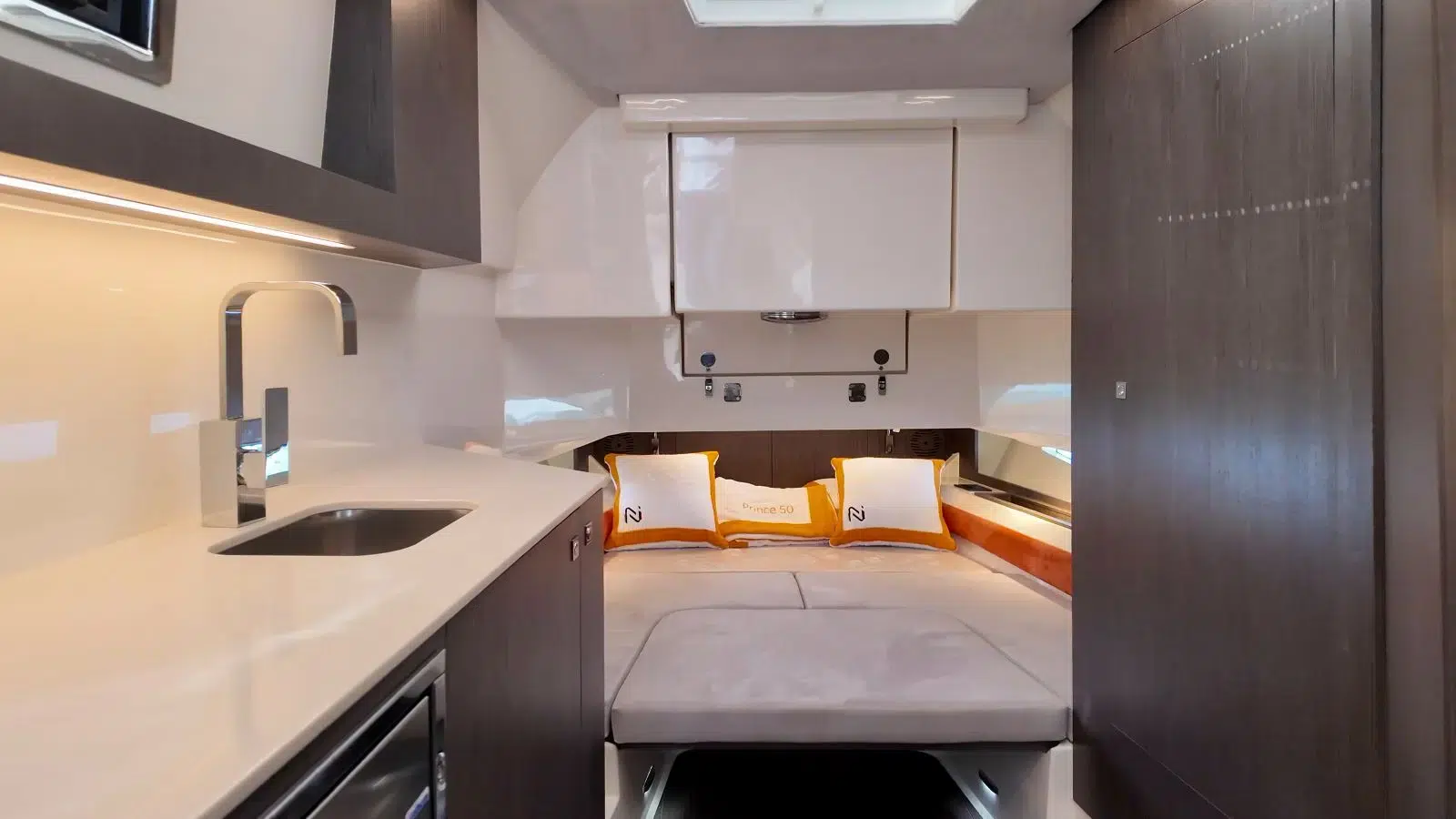 The aft cabin of the Prince 50, located directly beneath the cockpit, is just as impressive, furnished with a comfortable queen-size bed and offering plenty of storage space.
