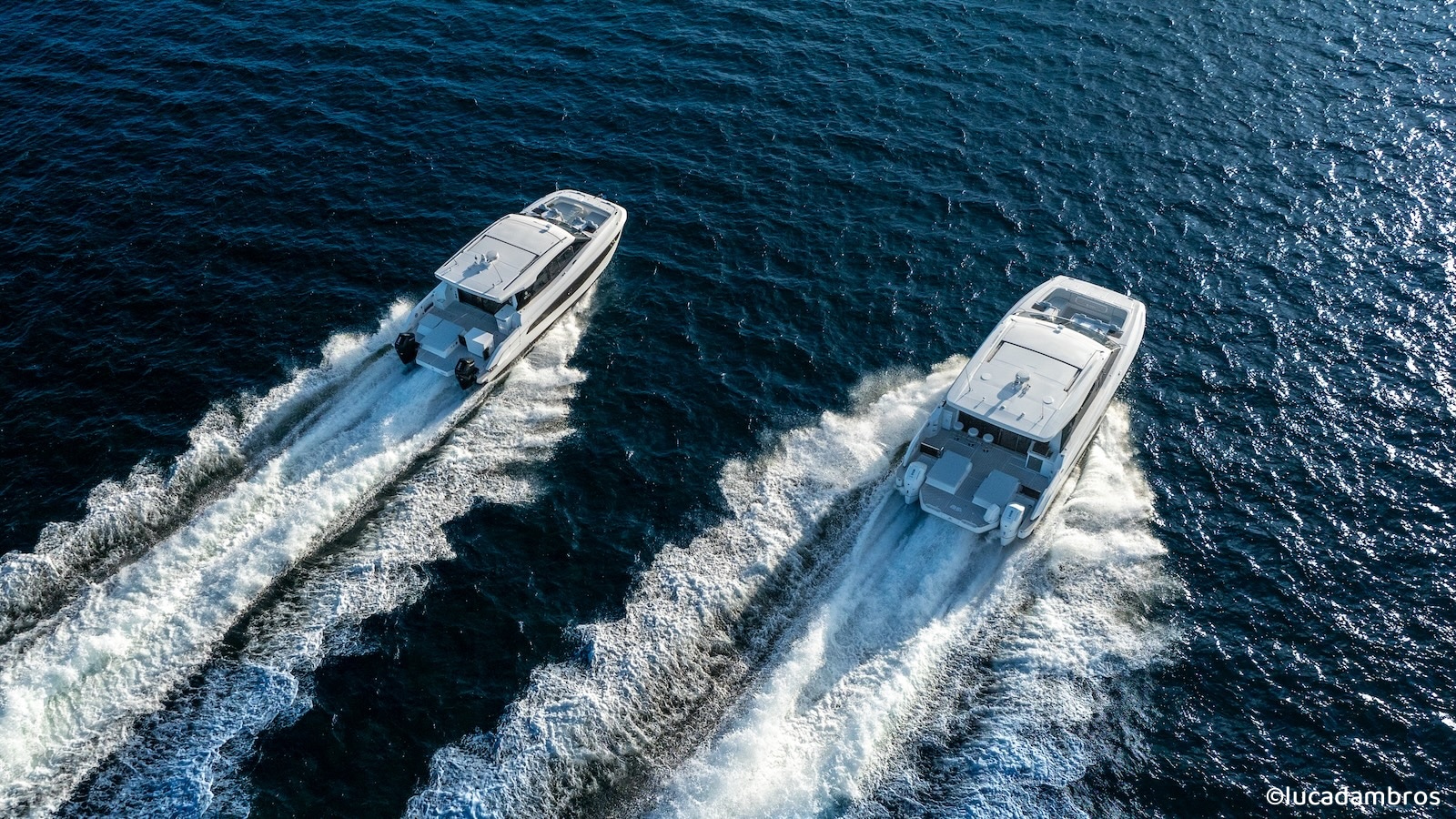 I launch the drone and literally chase after the 42 and 46 as they speed along together—they’re seriously fast. I call over the radio, asking them to slow down, and finally manage to get some decent shots. From above, I get an even clearer view of how effortlessly they glide across the water. Their wakes are barely a quarter of what a monohull would leave behind.