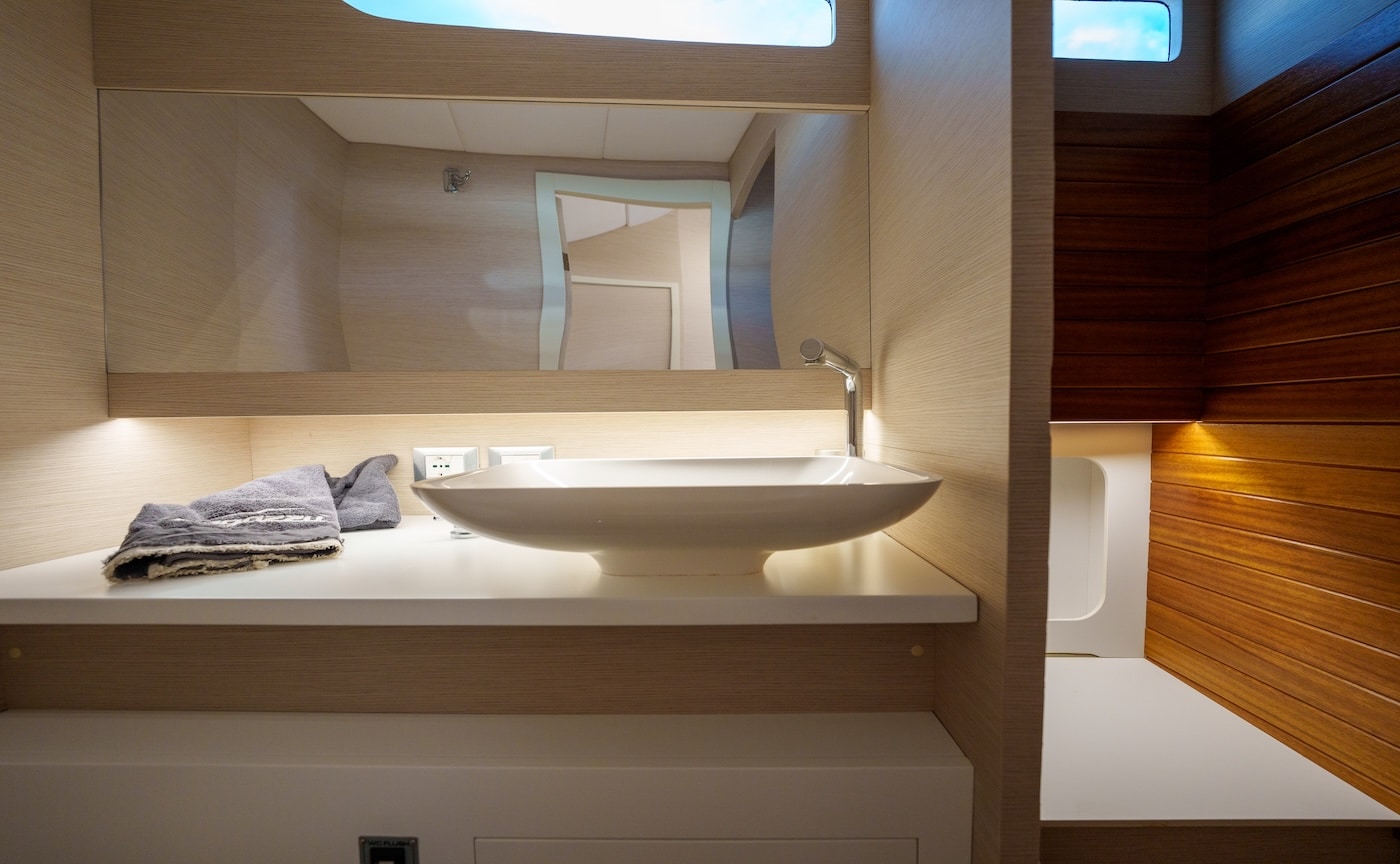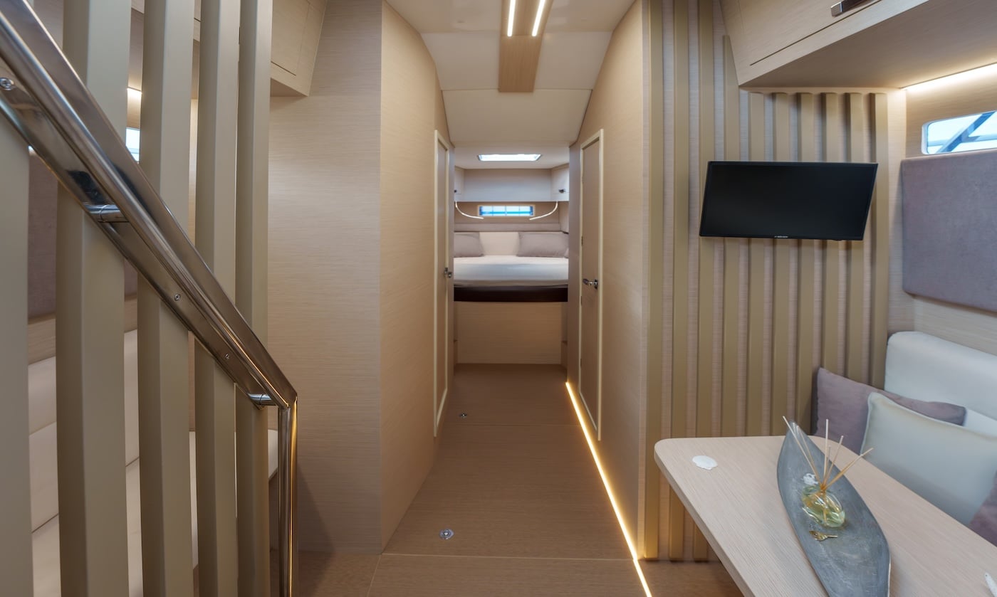 The model we tested, which reflects the specifications chosen by its discerning owner, not only features IPS propulsion but also boasts interiors specifically customized to meet their needs. As we descend to the lower deck, we are greeted by a dinette, equipped with an L-shaped sofa and table to starboard and a matching sofa to port, comfortably seating 5 to 6 guests.
