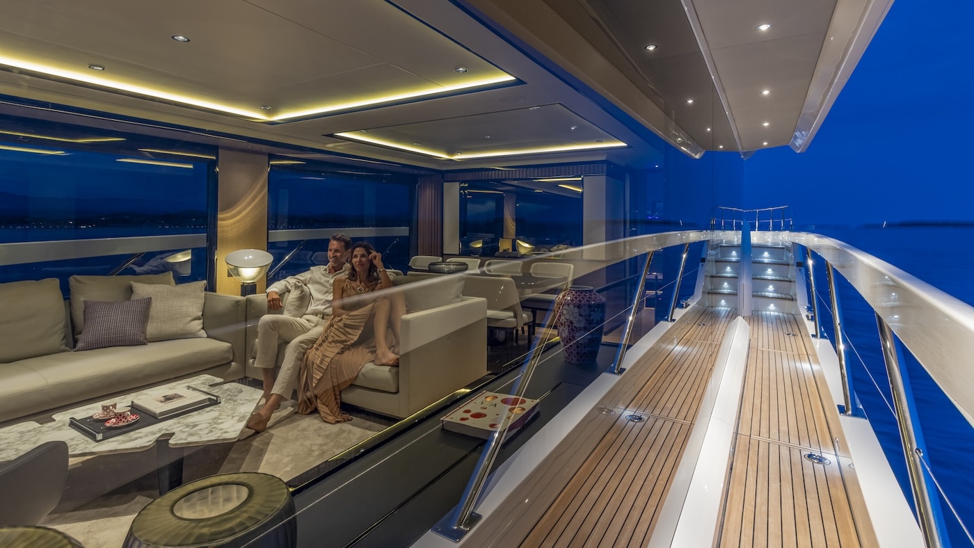 The main deck design has undergone significant updates as well, including the introduction of ceramic details that create a striking visual effect and an electric mechanism for the table. This feature, only used at specific times of the day, can easily be stowed away to free up more space. The aft platform will also be something entirely new on the market—a fresh concept that combines movement, safety, comfort, and functionality.
