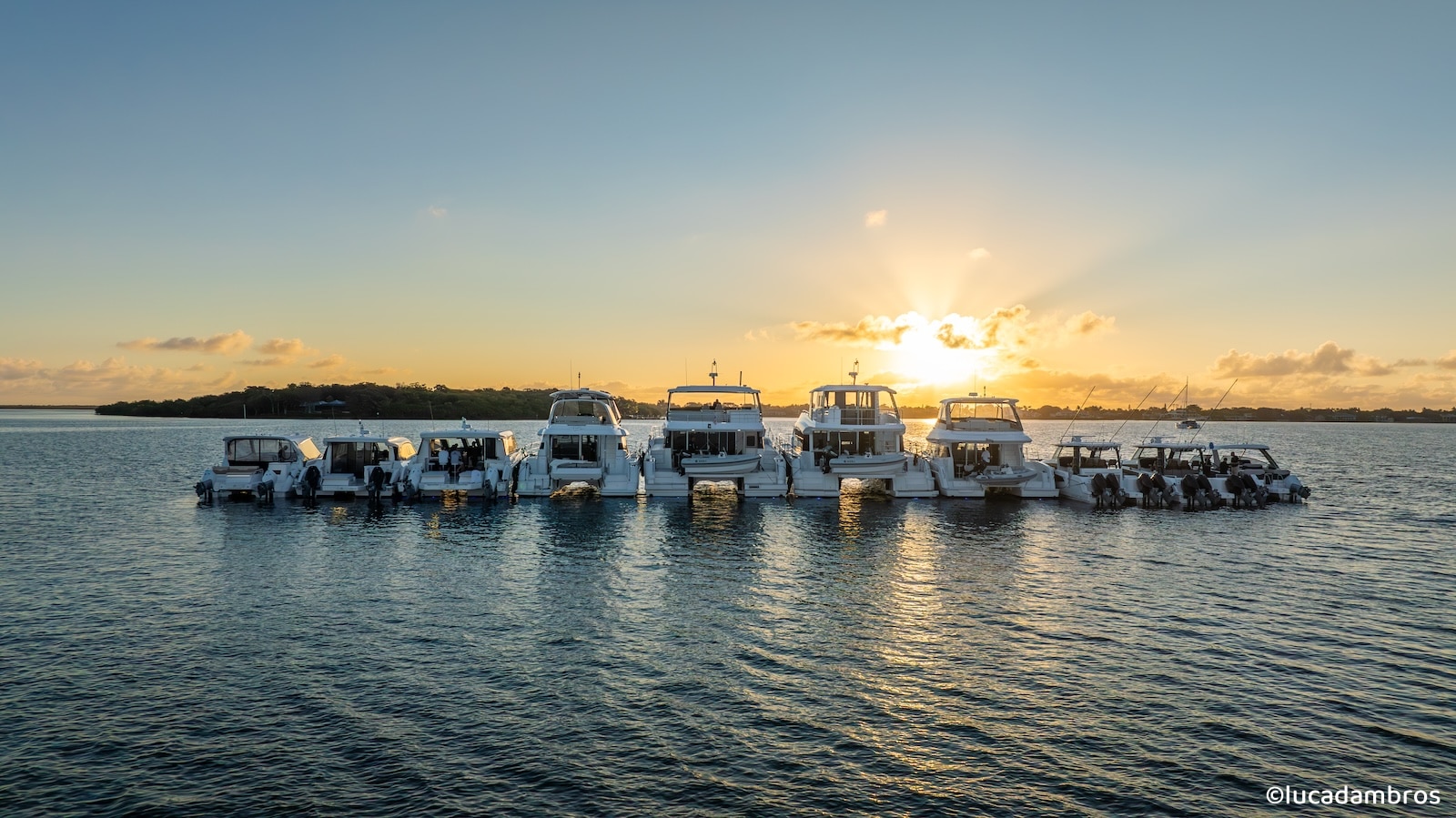 It’s impressive how effortlessly ten catamarans raft up together—the whole process takes no more than half an hour. As the sun starts to set, I rush to my cabin, grab my drone, and launch it immediately. These are the kind of shots I simply can’t miss.