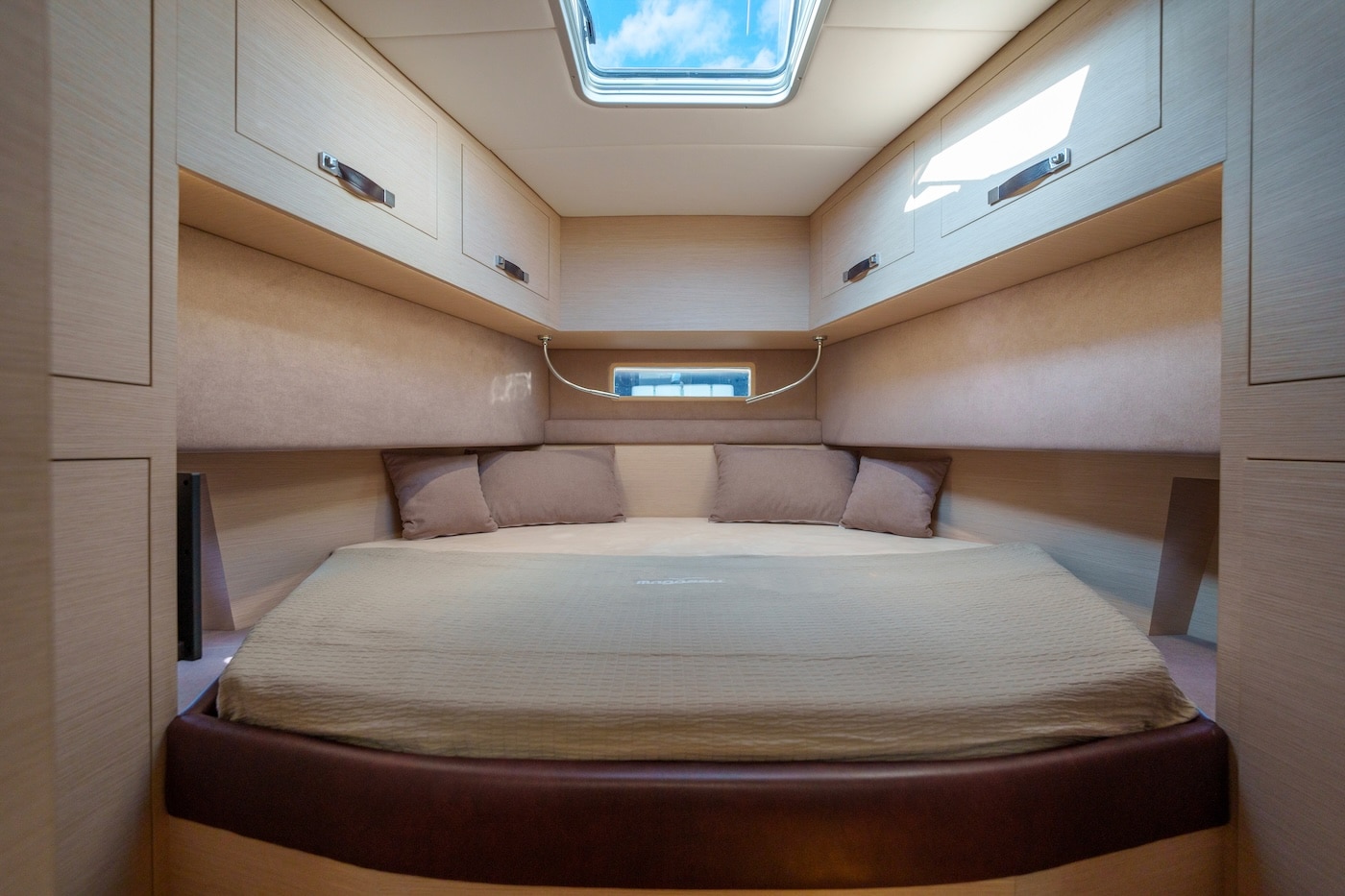 Heading aft, we discover the second cabin of the Magazzù M16 that, despite being located beneath the cockpit, still offers more than enough headroom for comfortable sleeping. In this case too, the bed is generously sized.